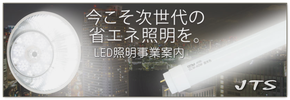 株式会社ジェイティエスでは、東日本大震災以後、 社会貢献出来る商材を第一に考え、ecoに繋がる LED照明のご提案をさせて頂いております。 安かろう、悪かろうな商品とは一線を画す、長く使える より良い商品をご提供させて頂きます。 LED照明の詳細については こちらからご覧頂けます。 >>>>> | |||||||||||
